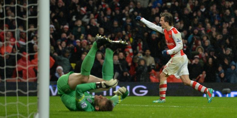 Gelandang Arsenal, Tomas Rosicky, seusai mencetak gol ke gawang Queens Park Rangers pada lanjutan Premier League di Stadion Emirates, Jumat (26/12/2014).