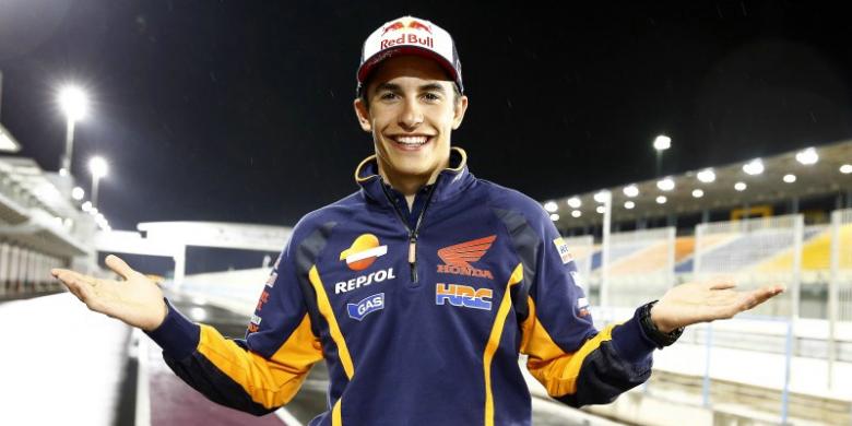 Pebalap Repsol Honda asal Spanyol, Marc Marquez, berpose di pit Sirkuit Losail, Qatar, pada hari ketiga uji coba pramusim, Senin (16/3/2015).